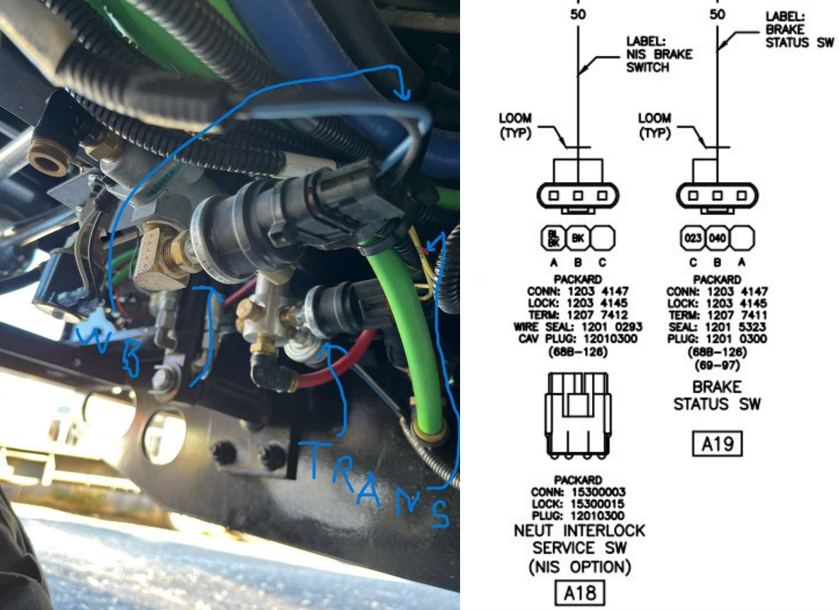 To resolve a specific fault condition in 2024–2025 chassis where the transmission becomes stuck in neutral with a flashing "N" on the shift pad. This procedure identifies and corrects a wiring error involving twin 50-inch brake status harnesses.